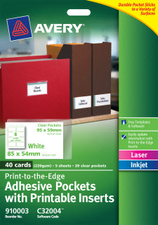AVERY 910003 C32004 ADHESIVE POCKETS WITH PRINTABLE INSERTS 8 UP PACK 40