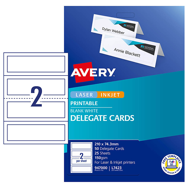 AVERY 947000 L7423 DELEGATE CARDS EMBOSSED 2UP 210 X 74.25MM 150GSM PACK 25