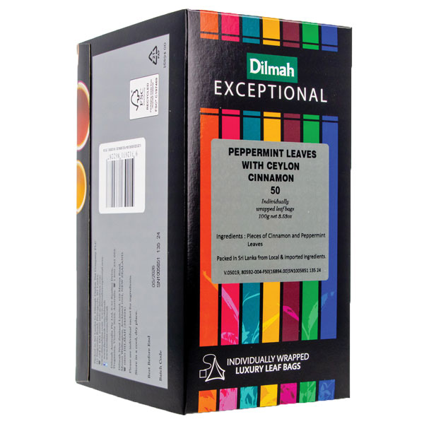 DILMAH EXCEPTIONAL TEA BAGS PEPPERMINT CINNAMON INFUSION FOIL ENVELOPED BOX 50