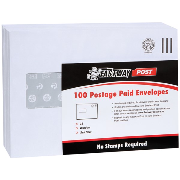 FASTWAY POST ENVELOPE POSTAGE INCLUDED WINDOW SELF SEAL C5 E23 W229 X L162MM WHITE PACK 100