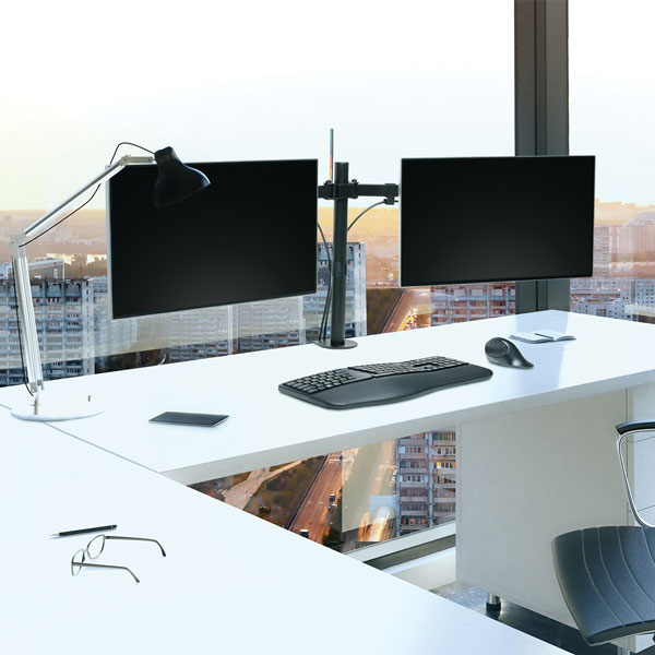 Quick-release VESA 75/100 mounting plates accommodate monitors up to 32inch and 8kg/17.6lbs (per arm)